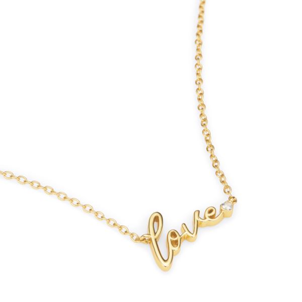 Refined chain necklace featuring playful Love script pendant adorned with minimal crystal stone perfect for everyday. Necklace has an adjustable lobster clasp closure. Includes signature Kurt Geiger London jewelry pouch.
